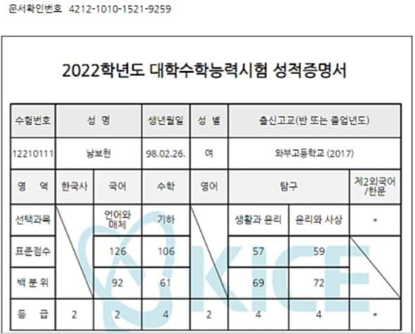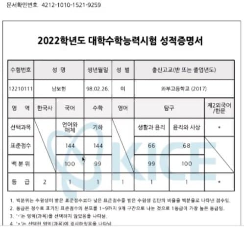 여담으로 해당 문서의 진위 여부는 커뮤니티 유저들의 과도한 확인으로 인해 하루 확인치를 초과해서 현재는 조회되지 않고 있다. 더군다나 탐구과목은 국어와 수학보다 1등급을 맞기 상대적으로 쉬운데 4등급을 맞았다는 것은 탐구과목 공부를 하지 않은 것이다.[21]